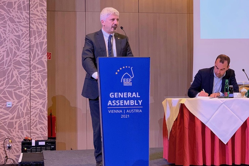(Comunicato Stampa FISE; Nella foto: Simone Perillo, durante il suo intervento in occasione dell’Assemblea generale delle EEF)