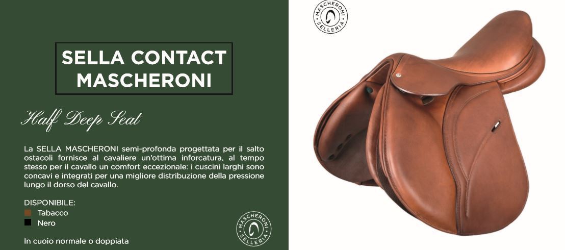 La nuova Sella Contact Mascheroni è progettata per il salto ostacoli. Fornisce al cavaliere un’ottima sensazione di contatto, libertà di movimento e al tempo stesso grande equilibrio, garantendo un centro di gravità perfetto in base al proprio riding-style.