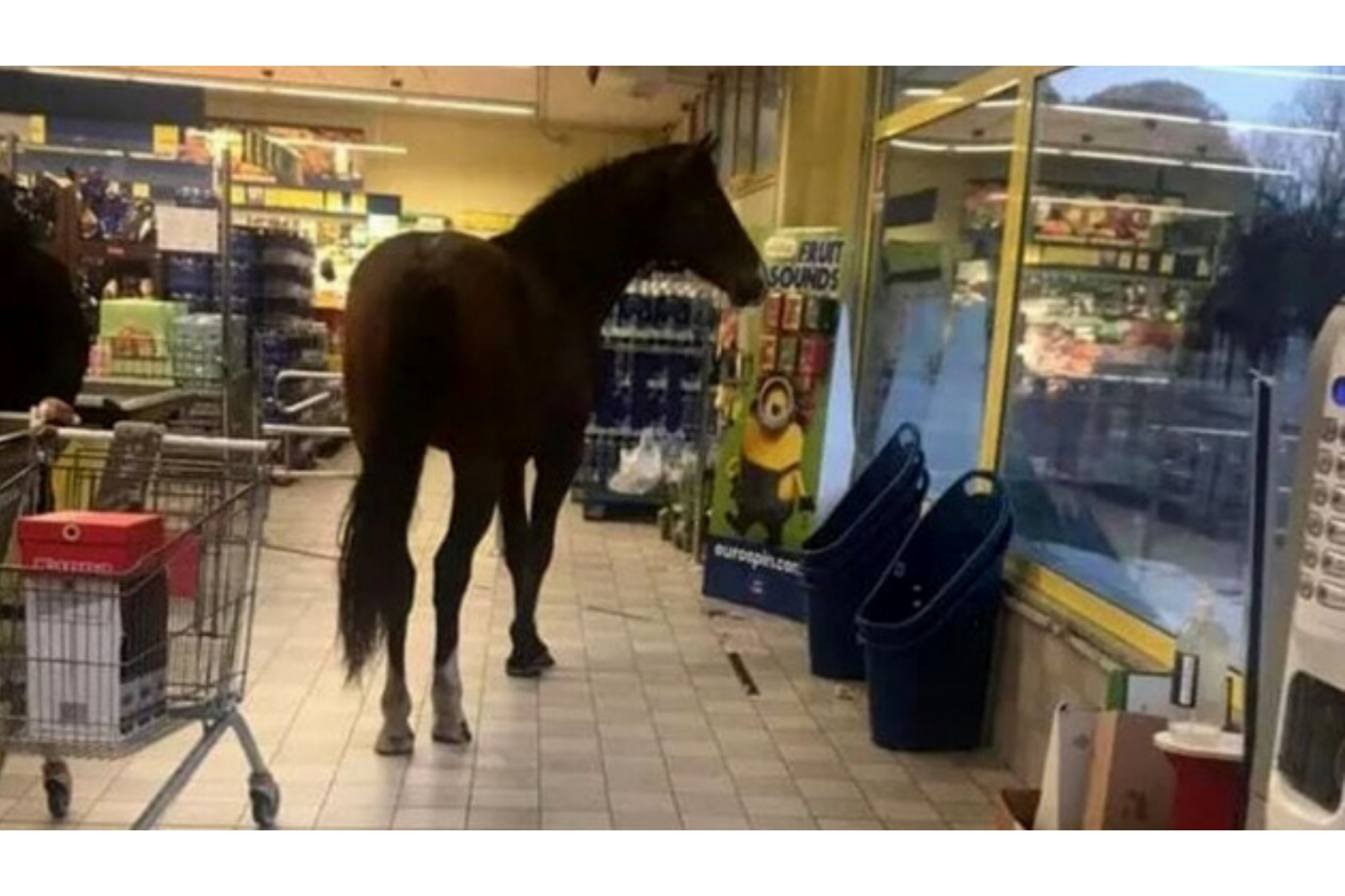 Stanno velocemente facendo il giro d’Italia le immagini del baio entrato al market, evento a dir poco inusuale: tra la sorpresa generale dei clienti, il cavallo è entrato attraverso le porte automatiche ed ha girato per un po’ tra i corridoi del market; nessuna scena di panico tra i reparti, né da parte dell’animale né tra i presenti, la cui maggioranza ha reagito con curiosità.