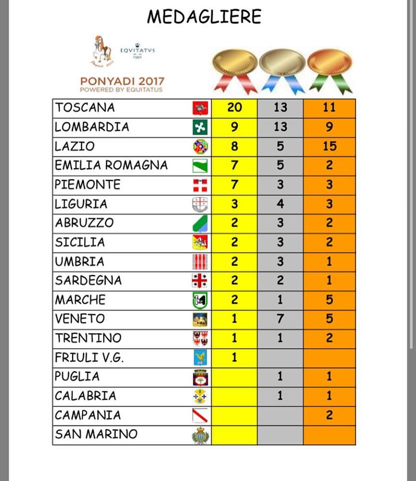 Tra le 18 regioni presenti, capolista nel medagliere delle Ponyadi 2017 powered by Equitatus 1991 va alla regione ospitante, ossia alla Toscana, incoronata dunque regina della manifestazione di interesse federale che ha visto la presenza di oltre 800 giovanissimi in 4 giorni di gara, impegnati nell’attività ludica di salto ostacoli, concorso completo, cross country, dressage, gimkana 2, gimkana jump 40, gimkana cross, pony games, carosello, presentazione, piccolo gran premio, volteggio, endurance, horseball, attacchi e gara di cultura equestre. Ben 20 le medaglie d’oro incamerate dalla Toscana! Il secondo posto è andato alla Lombardia con 9 ori, mentre il terzo al Lazio con 8.