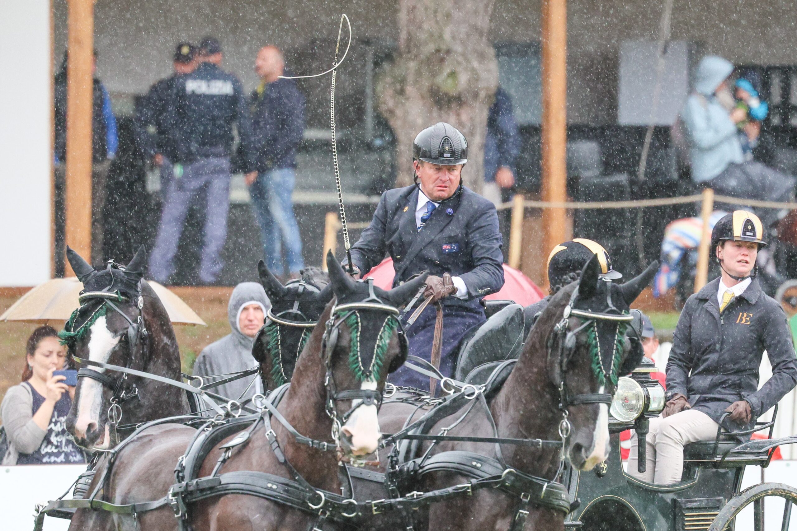 Primo nel dressage e sesto nella maratona, Exell oggi è stato impeccabile tra i coni, rimediando solo 5,92 penalità sul tempo. L’australiano è entrato in campo sotto una fitta pioggia che tuttavia non ha condizionato il rendimento dei suoi cavalli (Celviro, Checkmate, Hero e Ivor). Sei ori mondiali consecutivi al collo, Exell ha confessato di aver avvertito un po’ di pressione, ma non propriamente quella che ci si sarebbe aspettata. «C’è un esercito dietro a ogni driver. Il nostro è uno sport di squadra in tutti i sensi, e la pressione che ho avvertito oggi è stata quella dei miei cavalli e di tutti coloro che erano qui con me. Il tracciato tra i coni sarebbe stato ancora più interessante se il terreno fosse stato un po’ meno insidioso a causa della pioggia. C’era pericolo di qualche scivolata… Durante il percorso ho avuto una piccola sbavatura che mi è costata qualche secondo ma ho pensato solo a rimanere calmo». Alla domanda di quali programmi avesse ora per la stagione agonistica, Exell ha fatto riferimento alla stagione indoor che per lui prenderà l’avvio con Lione. Non prima però di una bella e meritata vacanza.