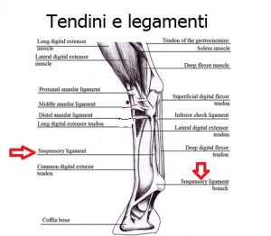 Il Legamento Sospensore del nodello è rappresentato principalmente da una robusta fascia tendinea rettangolare, lunga da venti a venticinque centimetri costituita da quantità variabili di tessuto muscolare (soprattutto nella porzione prossimale). Il legamento sospensore origina dal legamento palmare del carpo, prossimalmente alla fila distale delle ossa del carpo, e dalla superficie palmare delle ossa metacarpali, in particolar modo dal terzo osso metacarpale. Il corpo del Legamento sospensore scorre tra il secondo e il quarto osso metacarpale e gradualmente si separa dalla faccia palmare del metacarpo (Denoix, 1996). All’altezza del quarto distale del metacarpo il legamento si divide in due branche che s’inseriscono sulla faccia abassiale del corrispondente osso sesamoideo prossimale. Da ogni branca si stacca un sottile ramo che corre lungo la falange prossimale e si unisce al tendine estensore dorsale del dito appena prossimalmente all’articolazione interfalangea prossimale (Denoix, 1996).