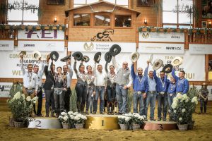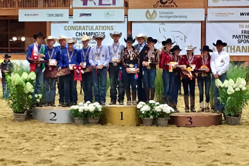 Il Team Junior guidato dal capo equipe Elena Giulia Montorsi, tecnico Alessandro Meconi, e composta da Matteo Manuel Bonzano su High Point Reiner (216,5); Vittorio De Iulio su Sailon Raf (214,5); Lisa Werdaner su Chic N Roost (214,0) e Matteo Capello su Rs Polyphemus Jac (213,5) ha chiuso il Campionato Mondiale giovanile con uno score totale di 645.00 determinando in questo modo la vittoria italiana, davanti agli Stati Uniti, argento con 639.00, e alla Francia, bronzo con 634,5. Sei le squadre in campo. Ottimo risultato anche per i reiners Young Riders, agli ordini del tecnico Alessandro Meconi (capo equipe Elena Giulia Montorsi), Dino Lulli su Sun Dreamin Star (217); Nico Scuro su Iam Sailors Brother (215,5); Andrea Costa su Quotacrome (213,5) e Enrico Sciulli su Snips Gotta Bud (216,0) hanno chiuso con uno score complessivo di 648,5. Oro, dunque, alla Germania (655,0), medaglia d’argento all’Italia (648,5), bronzo al Belgio (644,0).