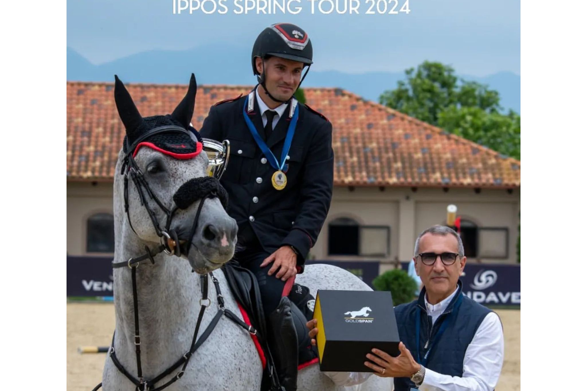 © L. Badulescu – riproduzione riservata; foto: Roberto Previtali ed Esteban de Hus premiati dal Silver Sponsor Emanuele Laiatici – CEO e Brand Manager Goldspan Italia © Instagram Ippos Club