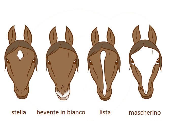 Vediamo allora alcuni esempi tra le diverse e molteplici varianti di macchie che possono essere presenti sul viso del cavallo – che, si noti, a causa della grande varietà, assumono anche nomi diversi: in generale, si parlerà di fiore per una piccola macchia dai contorni regolari; di palla di neve per una macchia bianca dalla forma arrotondata; di stella per una macchia bianca ma dai contorni irregolari; di lista per una striscia bianca che parte dalla fronte per giungere alle narici (froge), che può essere irregolare o interrotta; di bevente in bianco quando la macchia bianca interessa il labbro superiore o inferiore; di mascherina, quando la macchia bianca copre la maggior parte del viso. Una stella può essere di forma molto simmetrica. Questa macchia bianca sulla fronte di un cavallo, tra gli occhi, può apparire “debole” quasi come pochi capelli bianchi, o può essere abbastanza grande da coprire tutta la zona della fronte. Nei cavalli grigi, la stella può essere molto evidente quando il cavallo è giovane e scomparire nel mantello grigio a mano a mano che il cavallo invecchia; tuttavia, la pelle in corrispondenza della stella o macchia, sarà di un tono di colore più leggero. Si parlerà invece di liscio in presenza di una macchiolina rosa tra le narici, priva di pelo; può essere presente anche con le macchie bianche.