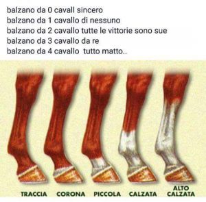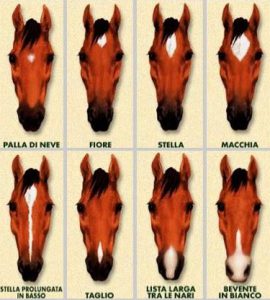 Horse Markings: tra gli elementi che contraddistinguono un cavallo da un altro, più del mantello, sono le macchie presenti sul muso, sul tronco e sugli arti (particolarità a sede fissa). Questi “segni particolari” sono scrupolosamente registrati sul certificato identificativo (passaporto) che deve accompagnare il nostro cavallo in qualsiasi spostamento, e pertanto è molto importante saperle riconoscere: insieme ai remolini (cambiamenti di direzione del pelo in piccole zone del corpo, che possono a loro volta avere svariate forme: semplice, sinuoso, spigato), e alle eventuali calze o balze sugli arti, ne determinano e garantiscono l’identità.