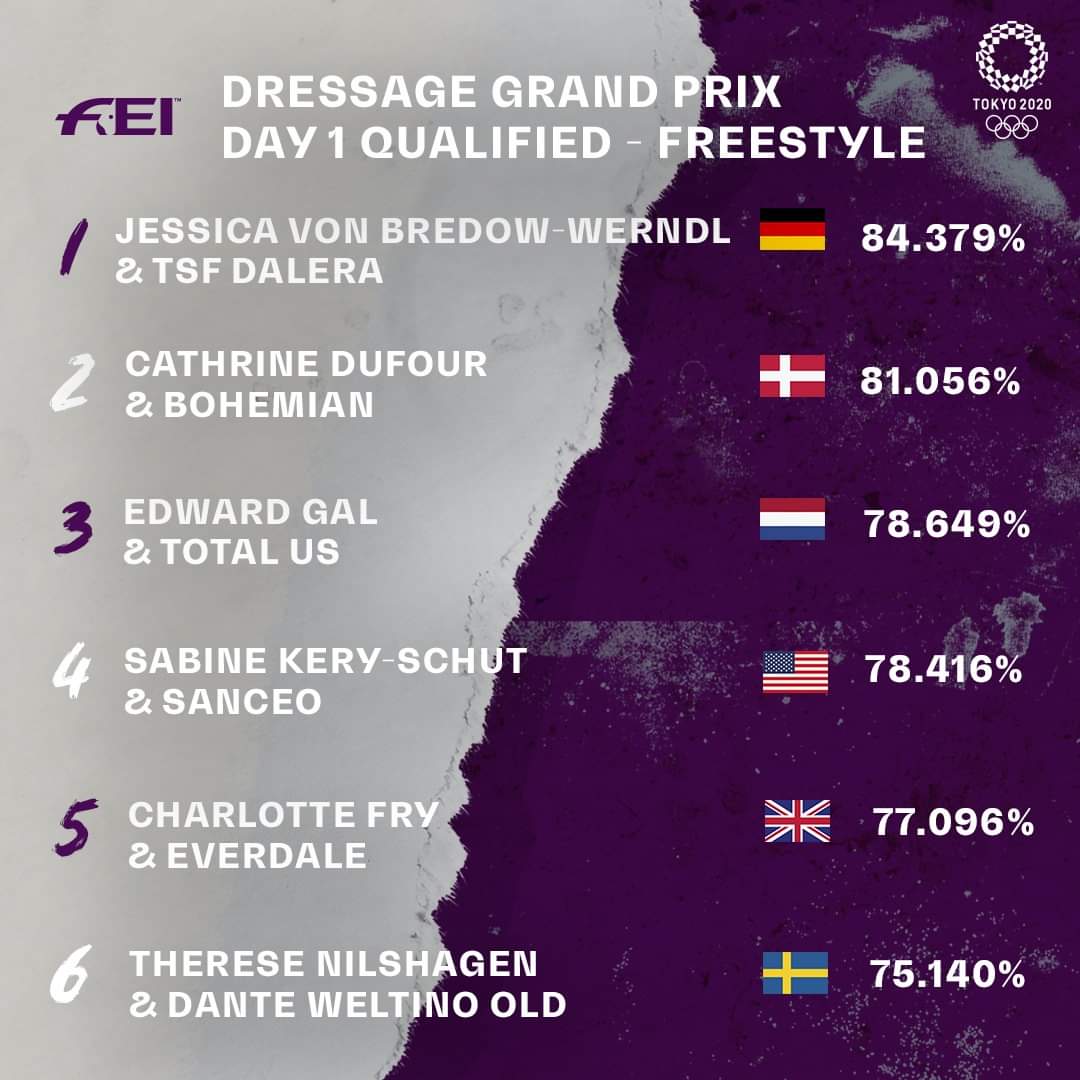 Alla fine della giornata, sei binomi si sono assicurati il diritto ad accedere alla gara di mercoledì. Sabine Schut-Kery degli Stati Uniti e Sanceo (78,416%), Charlotte Fry della Gran Bretagna e Everdale (77,096%), e Therese Nilshagen della Svezia con Dante Weltino OLD (75,140%) potranno affrontare la prova di freestyle, insieme ai succitati primi tre.