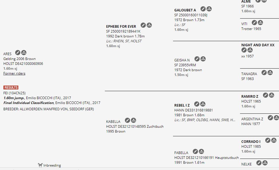 Bicocchi e Ares sono stati insieme sin dal lontano 2014, anno del primo risultato del binomio nell’archivio FEI; precedentemente, nel 2013, il cavallo era sotto la sella di Davide Contatore.