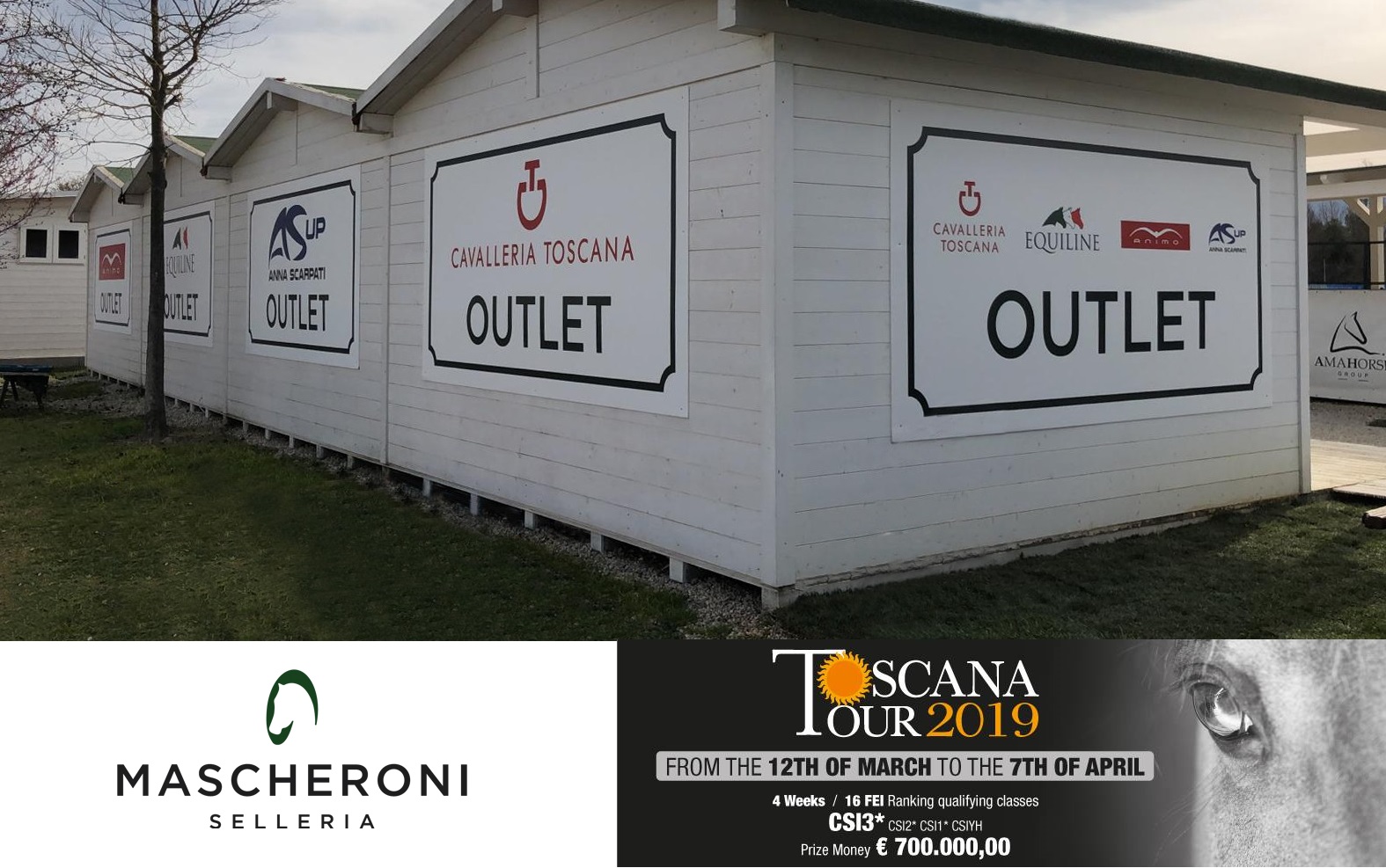 E’ iniziato il Toscana Tour 2019, tradizionale appuntamento agonistico primaverile presso gli impianti dell’Arezzo Equestrian Centre – Località Gentile, 49 (San Zeno – Arezzo) del quale Mascheroni Selleria è, come di consueto, tra gli sponsor: con 4 settimane di Tour (CSI3*-2*-1*-YH) in programma dal 12 marzo al 7 aprile prossimo, un Montepremi di 700.000,00 euro complessivi e ben 16 categorie valide per la Longines Ranking, anche quest’anno vi è grande attesa per quel che si preannuncia uno spettacolare evento per il salto ostacoli internazionale su suolo italiano.